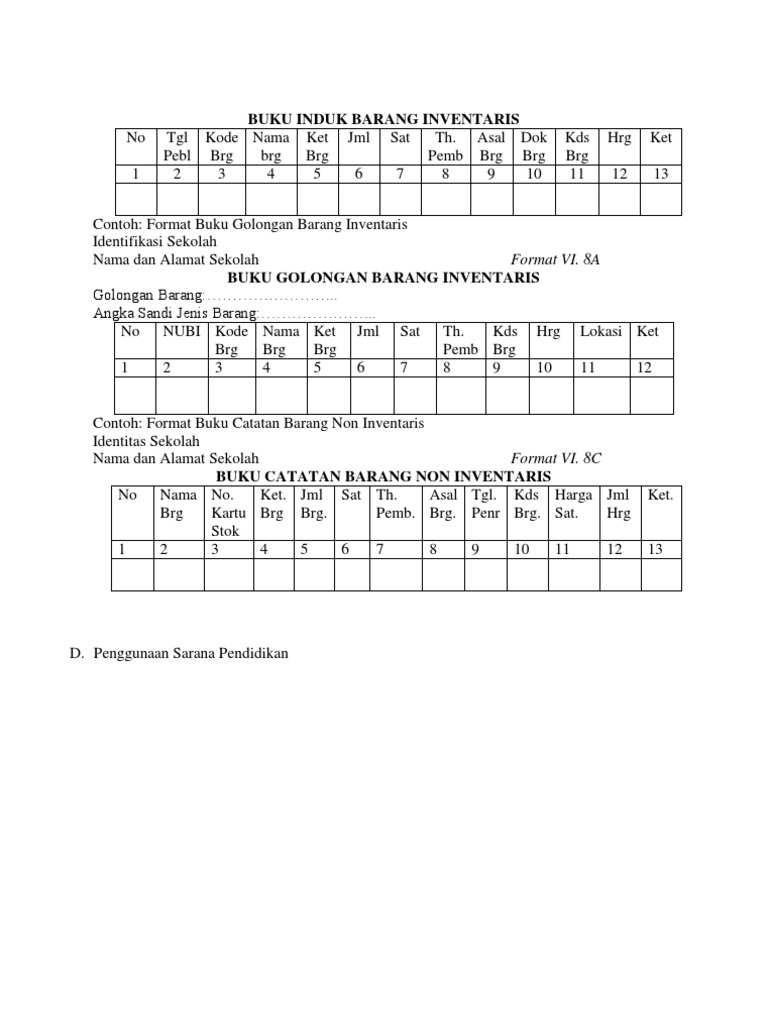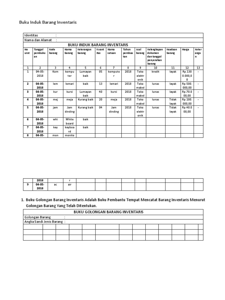 Contoh buku induk barang inventaris. Contoh buku induk inventaris barang sekolah.dokumen contoh format daftar barang inventaris sekolah tahun. Nomor induk menandai setiap buku dan berguna untuk membedakan buku yang satu dengan yang lainya. Buku tersebut penting dikarenakan juga menyangkut barang yang dibeli dengan menggunakan dana dari pemerintah. Nomor inventaris disebut juga dengan nomor induk buku yang merepresentasikan bahwa buku tersebut merupakan koleksi ke… (sekian) yang dimiliki perpustakaan.