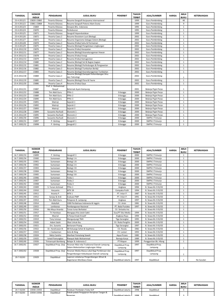 Sebelum bulan september 2012, kegiatan inventarisasi buku, khususnya dalam menentukan nomor inventaris buku, dilakukan dengan penghitungan manual, sehingga sering terjadi kesalahan dalam penomoran inventaris buku. Sebuah setiap eksemplar bahan pustaka memiliki nomor induk yang berbeda meskipun judul, pengerang, penerbit, dan tahun terbitnya sama. Asal dok pebl brg brg brg pemb brg brg 2 3 4 5 6 7 8 9 10. Buku catatan barang non inventarsi. Buku golongan barang inventaris 8.